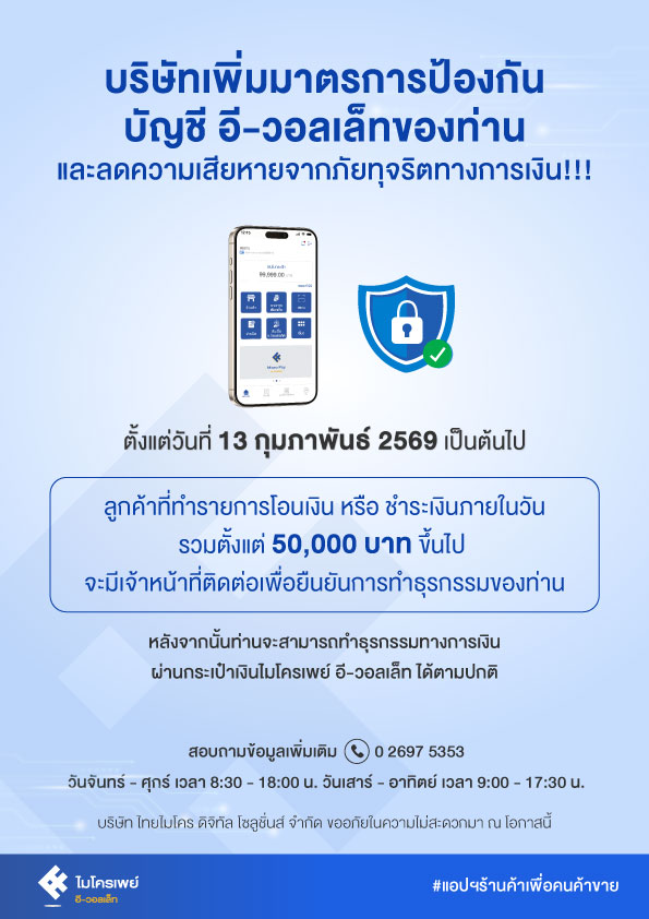เพิ่มมาตรการป้องกันบัญชี อี-วอลเล็ทของลูกค้า ตั้งแต่วันที่ 13 กุมภาพันธ์ 2569 เป็นต้นไป