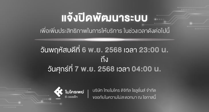 แจ้งปิดให้บริการชั่วคราว ในวันที่ 6 -7 พฤศจิกายน 2568 เพื่อพัฒนาระบบให้มีประสิทธิภาพมากยิ่งขึ้น