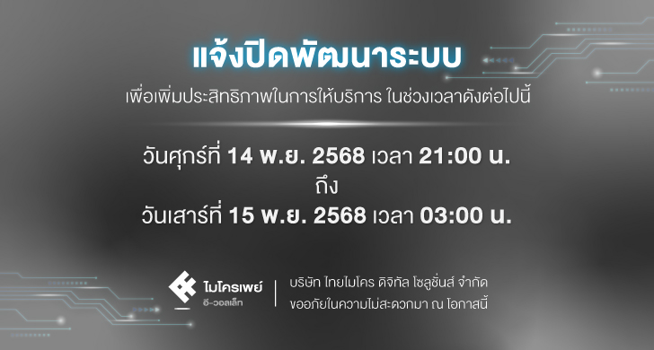 แจ้งปิดให้บริการชั่วคราว ในวันที่ 13-14 พฤศจิกายน 2568 เพื่อพัฒนาระบบให้มีประสิทธิภาพมากยิ่งขึ้น