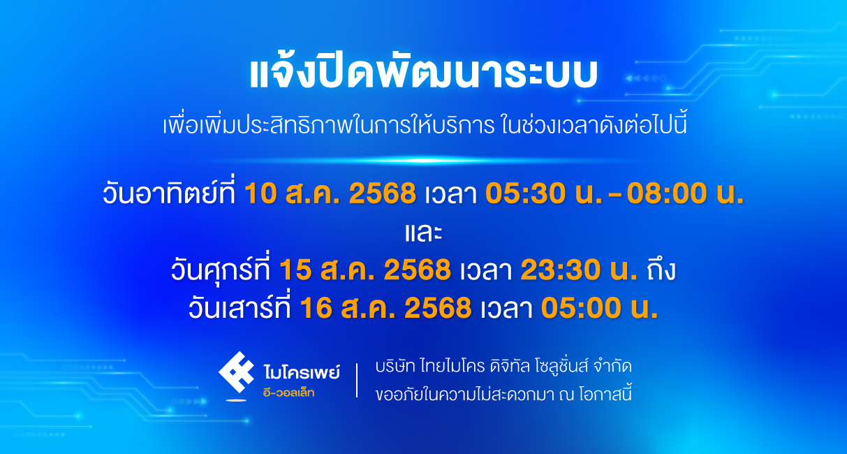 แจ้งปิดให้บริการชั่วคราว ในวันที่ 13-14 พฤศจิกายน 2568 เพื่อพัฒนาระบบให้มีประสิทธิภาพมากยิ่งขึ้น