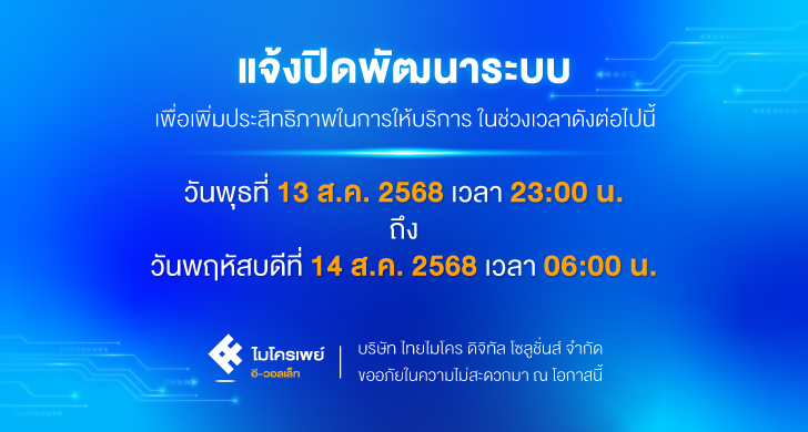 แจ้งปิดให้บริการชั่วคราว ในวันที่ 13-14 สิงหาคม 2568 เพื่อพัฒนาระบบให้มีประสิทธิภาพมากยิ่งขึ้น