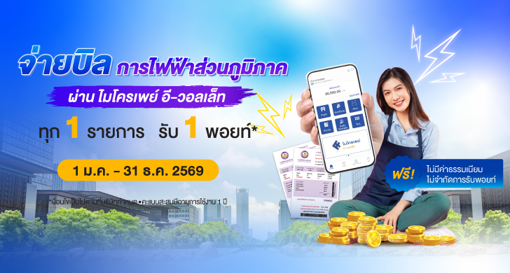 จ่ายบิลการไฟฟ้าส่วนภูมิภาค ผ่านไมโครเพย์ อี-วอลเล็ท ตั้งแต่ 50 บาทรับ 1 พอยท์ ต่อ รายการ และฟรีไม่มีค่าธรรมเนียม (1 ม.ค. - 31 ธ.ค. 2569)