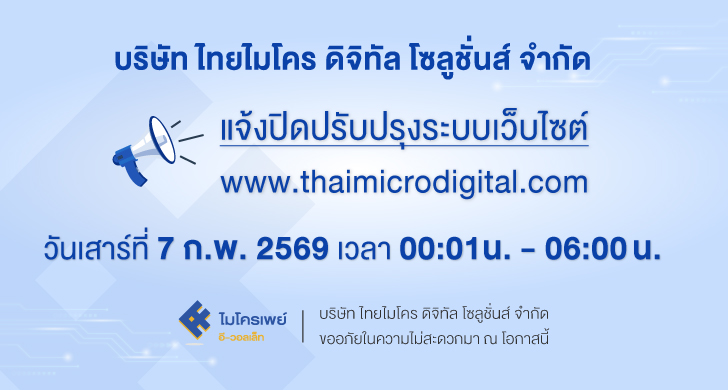 แจ้งปิดให้บริการชั่วคราว ในวันที่ 12-13 กุมภาพันธ์ 2569 เพื่อพัฒนาระบบให้มีประสิทธิภาพมากยิ่งขึ้น