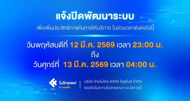 แจ้งปิดให้บริการชั่วคราว ในวันที่ 12-13 มีนาคม 2569 เพื่อพัฒนาระบบให้มีประสิทธิภาพมากยิ่งขึ้น