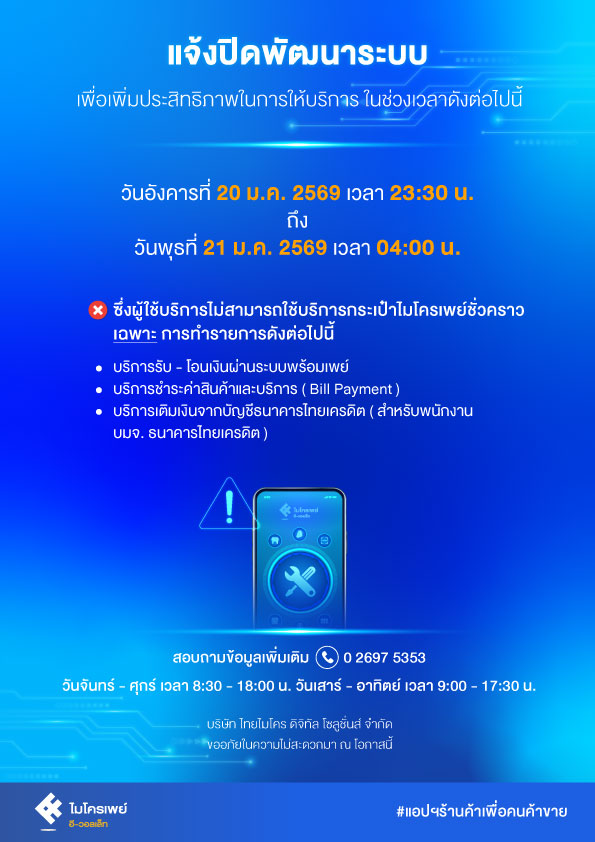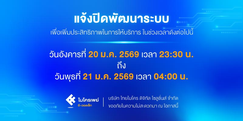 แจ้งปิดให้บริการชั่วคราว ในวันที่ 20-21 มกราคม 2569 เพื่อพัฒนาระบบให้มีประสิทธิภาพมากยิ่งขึ้น