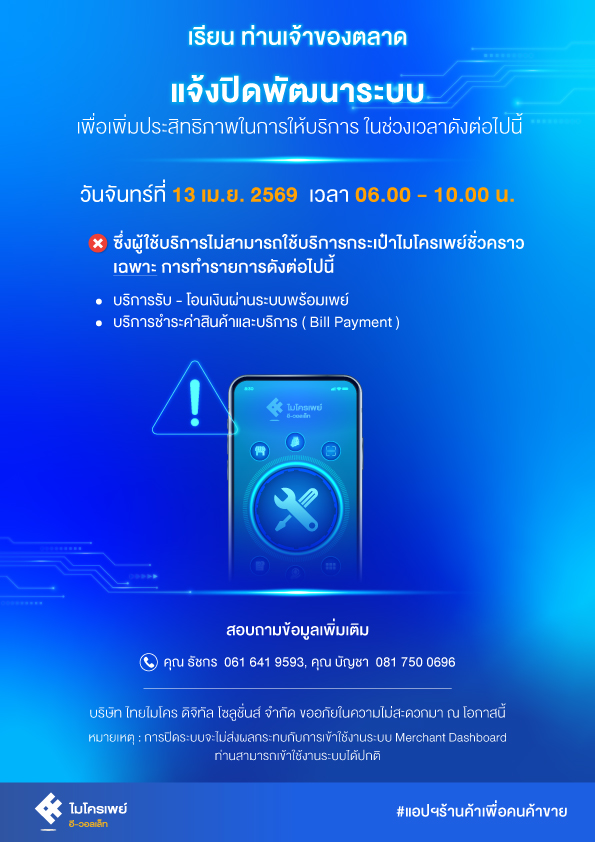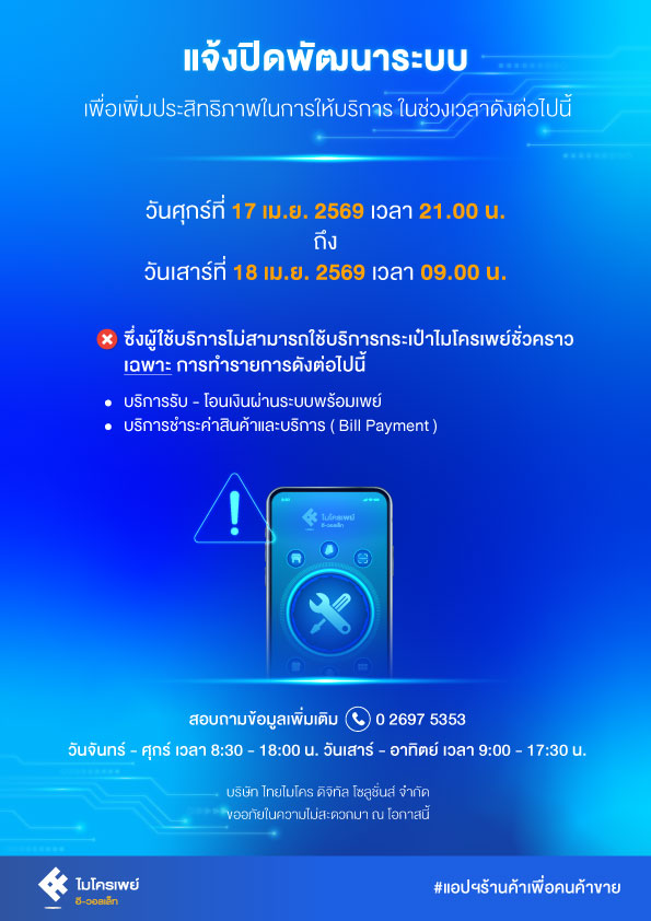 แจ้งปิดให้บริการชั่วคราว ในวันที่ 13 เมษายน 2569 เพื่อพัฒนาระบบให้มีประสิทธิภาพมากยิ่งขึ้น