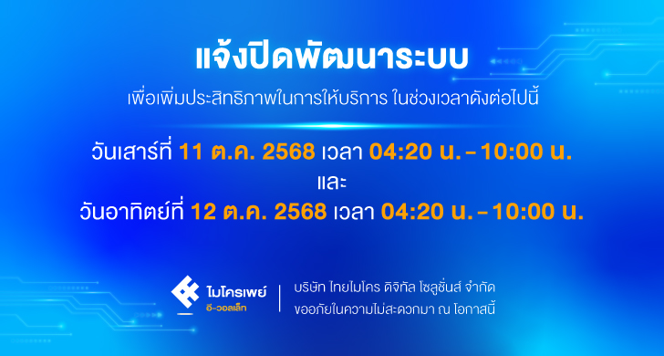 แจ้งปิดให้บริการชั่วคราว ในวันที่ 11-12 ตุลาคม 2568 เพื่อพัฒนาระบบให้มีประสิทธิภาพมากยิ่งขึ้น