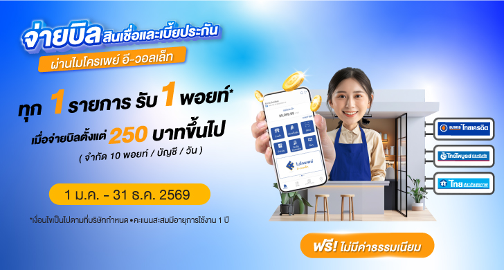 จ่ายบิลชำระสินเชื่อ หรือชำระค่าเบี้ยประกัน ผ่านไมโครเพย์ ตั้งแต่ 250 บาทรับ 1 พอยท์ และฟรีไม่มีค่าธรรมเนียม (1 ม.ค. - 31 ธ.ค. 2569)