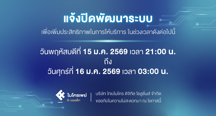 แจ้งปิดให้บริการชั่วคราว ในวันที่ 15-16 มกราคม 2569 เพื่อพัฒนาระบบให้มีประสิทธิภาพมากยิ่งขึ้น
