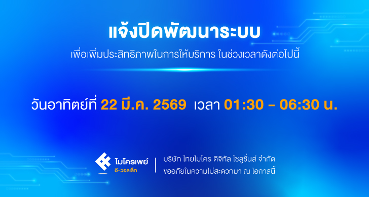 แจ้งปิดให้บริการชั่วคราว ในวันที่ 22 มีนาคม 2569 เพื่อพัฒนาระบบให้มีประสิทธิภาพมากยิ่งขึ้น