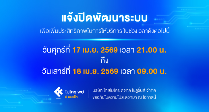 แจ้งปิดให้บริการชั่วคราว ในวันที่ 17-18 เมษายน 2569 เพื่อพัฒนาระบบให้มีประสิทธิภาพมากยิ่งขึ้น